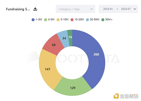 單筆融資規模: 100~300萬規模占比40%為最高, 500~1000萬占比22%次之。300~500萬規模融資相比2023年有所減少,減少的部分增加在100~ 300萬以及500-1000萬區間,也代表2024項目融得金額中間地帶減少,較為分化。
