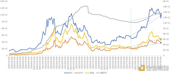 在宏觀調(diào)控下,比如大量降息和印錢的時(shí)候,這些資金自然會(huì)流向交易市場。自20年開始,crypto市場開始和美股高度正相關(guān)。自2021年年初crypto行業(yè)成長為萬億美金的賽道后,和宏觀的利率息息相關(guān)。在17-20年的cycle中,和利率不相關(guān)還是因?yàn)轶w量太小。市場上熱錢數(shù)量大小可以用穩(wěn)定幣的鑄造量衡量。2021年年底全市場穩(wěn)定幣數(shù)量達(dá)到ATH是1620億美金,即使經(jīng)過半年的上漲攻勢(shì),穩(wěn)定而數(shù)量依舊只是1500億美金。