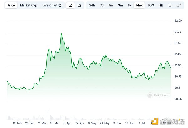 對(duì) JUP 的賦能較少是 Jupiter 項(xiàng)目的一個(gè)顯著缺點(diǎn),在其設(shè)計(jì)中并沒有加入質(zhì)押機(jī)制,從而減少了對(duì) JUP Tokens鎖定來增加項(xiàng)目價(jià)值這一個(gè)關(guān)鍵點(diǎn),并且現(xiàn)在 JUP Tokens流通率為 13.5% ,在今后隨著每次空投的解鎖都會(huì)向市場中投放 10 億枚 JUP,屆時(shí)將是巨大的市場拋壓,所以對(duì) JUP Tokens更多的價(jià)值增加是來自 Jupiter 項(xiàng)目的本身價(jià)值,有點(diǎn)類似于 UNI 和 Uniswap 的情況,并且 JUP 也沒有質(zhì)押參與分取項(xiàng)目收入的這一項(xiàng),從而導(dǎo)致項(xiàng)目對(duì)其賦能較小,JUP 的上漲只能是依賴于 Jupiter 的發(fā)展趨勢和用戶們對(duì) Jupiter 未來的看好。Tokens價(jià)格表現(xiàn)