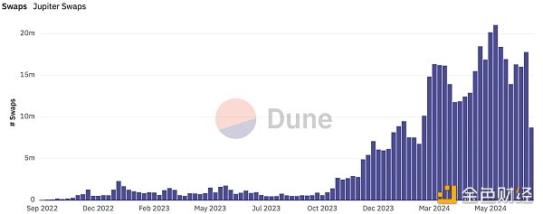 Jupiter 為交易用戶提供了多種產(chǎn)品,比如限價(jià)單、DCA 定投以及衍生品交易等多種服務(wù),從而能夠滿足用戶不同的各種使用需求。在這方面上,Jupiter 可以說是盡最大可能的幫助客戶解決在交易中遇到的各種問題,不僅僅是流動(dòng)性聚合器的單項(xiàng)產(chǎn)品角度出發(fā),而是用金融的發(fā)展角度為用戶提供了全方位的金融服務(wù),不僅能夠滿足用戶的各種金融需求,也能為交易用戶在各種不同的市場階段來提供最合適的金融服務(wù)。
