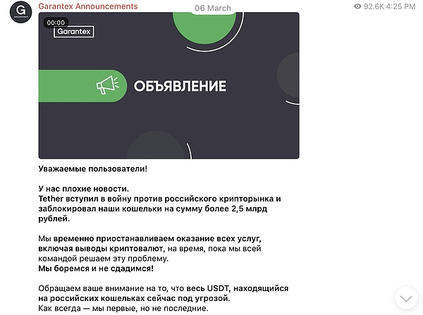 然而,隨著監(jiān)管升級,制裁的力度進(jìn)一步加大。2025年3月6日,穩(wěn)定幣發(fā)行方Tether凍結(jié)了約2800萬美元的USDT,涉及多個(gè)Garantex關(guān)聯(lián)錢包。Garantex被迫暫停所有交易和提現(xiàn),并在官網(wǎng)發(fā)布公告,警告俄羅斯用戶的USDT資產(chǎn)面臨風(fēng)險(xiǎn)。這一行動緊隨歐盟2月26日發(fā)布的第16輪對俄羅斯制裁,Garantex因與受制裁的俄羅斯銀行關(guān)系密切,被直接列入制裁名單。