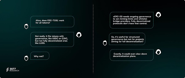 4.Tokens發(fā)行方的主權(quán)控制:發(fā)行方應(yīng)繼續(xù)控制在非原生鏈上鑄造的協(xié)議Tokens的標(biāo)準(zhǔn)版本。解決不可替代跨鏈Tokens的問題,不應(yīng)以讓渡Tokens控制權(quán)為代價(尤其是控制總供應(yīng)量,配置鑄造和銷毀機(jī)制等管理方面)。