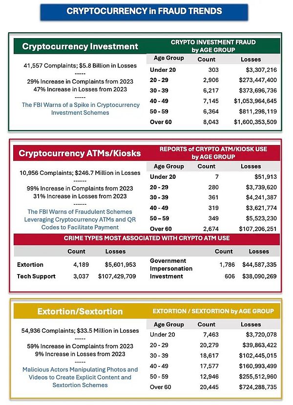 Crypto相關投訴達149,686起,造成93億美元損失,損失金額同比增長66%。受害者中,60歲以上群體占比最高。