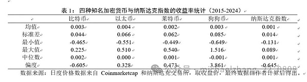 Bitcoin市場隨時間推移逐漸滿足弱有效市場假說,其價格會立即對公開市場信息做出反應,因此價格波動不僅十分劇烈,而且還具有顯著的波動性聚集特征(Urquhart,2018)。相較于Bitcoin,有關其他Crypto波動性的研究相對較少,且可能因市場規模、流通性等因素而存在差異,但從整體上看,其他Crypto也呈現出類似的波動性特征,反映出市場風險和不確定性較高。本文選擇了四種推出時間較早且具有較高知名度和市場流動性的Crypto,與美國股市(納斯達克指數)的波動情況進行簡單對比分析。從表1來看,Bitcoin、以太幣、萊特幣和狗狗幣的收益率標準差均遠大于納斯達克指數,意味著前者具有更高的波動性。狗狗幣收益率的最大值高達1.516,表示購買狗狗幣理論上最多可以實現150%/天的收益。