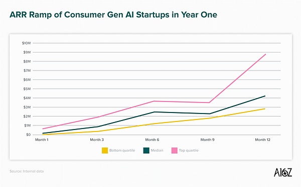 更讓我印象深刻的是,a16z投資人觀察到頂級表現者和普通表現者之間的差距正在擴大。許多突破性公司在第一年持續加速,而不是像我們在前AI時代經常看到的那樣開始放緩增長。這表明,對于優秀產品,無論是企業用戶還是消費者都有巨大需求,所以值得大膽嘗試。