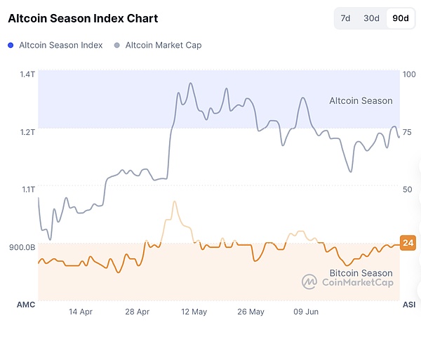 BTC主導指數:截至6月31日,當前BTC主導指數為64%,持續攀升。