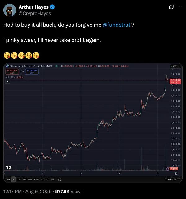同月早些時(shí)候,他以宏觀經(jīng)濟(jì)擔(dān)憂為由,在Ethereum價(jià)格接近3500美元時(shí)賣出了832萬美元的Ethereum。當(dāng)ETH反彈至4150美元以上時(shí),他重新買回,并在社交媒體上承認(rèn):“不得不全部買回來。我發(fā)誓,我再也不會獲利了結(jié)了。”