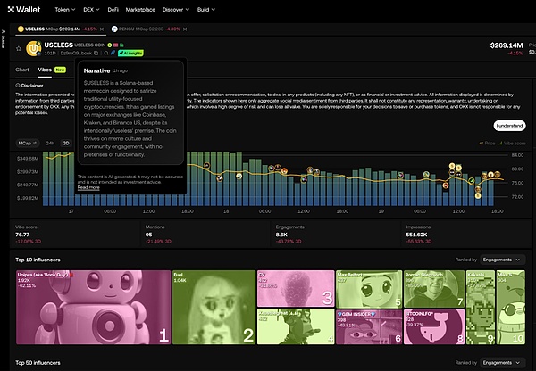 Kaito和Cookie.fun等Infofi工具對CryptoTwitter做內容做聚合與輿情分析,給出Mindshare、Sentiment、Influence的可量化指標。以Cookie.fun為例,其將這兩項指標數據直接疊加到價格圖表上,把鏈下情緒變成可讀的“技術指標”。