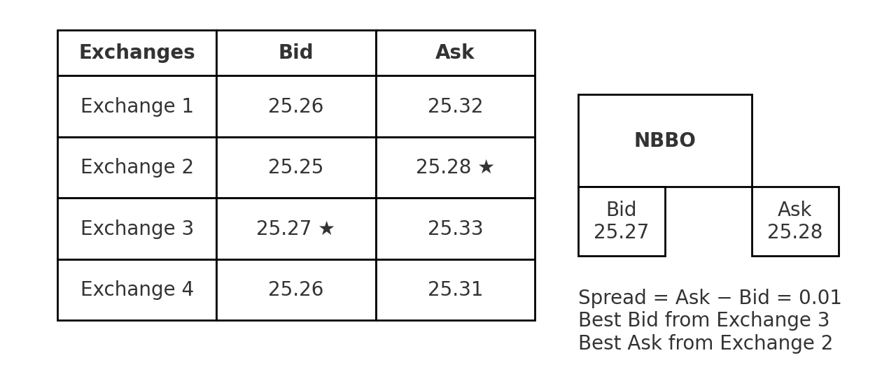 NBBO(NationalBestBidandOffer,全國最佳買賣價):把所有交易所的最佳買價和最佳賣價組合起來,成為衡量是否“穿透”的統一標尺。例如,上圖Exchange3的25.27是最佳買價,Exchange2的25.28是最佳賣價。