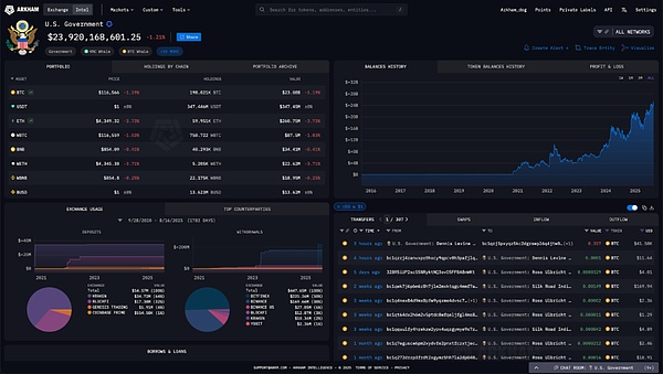 Grayscale是一家為公開市場提供多種產品的資產管理公司,是Crypto集團(DigitalCurrencyGroup)的子公司。Grayscale所有金融產品的數字資產也由Coinbase托管。雖然Grayscale公開報告其Bitcoin余額,但他們拒絕披露信托的鏈上地址——Arkham能夠找到這些地址,總計627,000枚Bitcoin,分布在超過1750個不同地址,每個地址持有不超過1000枚Bitcoin。Grayscale目前持有232,178枚Bitcoin,價值270.1億美元。哪個政府擁有最多Bitcoin