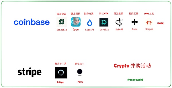 在融資之外,行業品牌自身也開始相互耦合,體現為2024-2025年并購周期,Coinbase收購Deribit補齊期權市場,Phantom收購錢包工具 Bitski,安全產品Blowfish和交易工具SolSniper,甚至是Stripe也在收購錢包服務Privy和穩定幣工具Bridge。