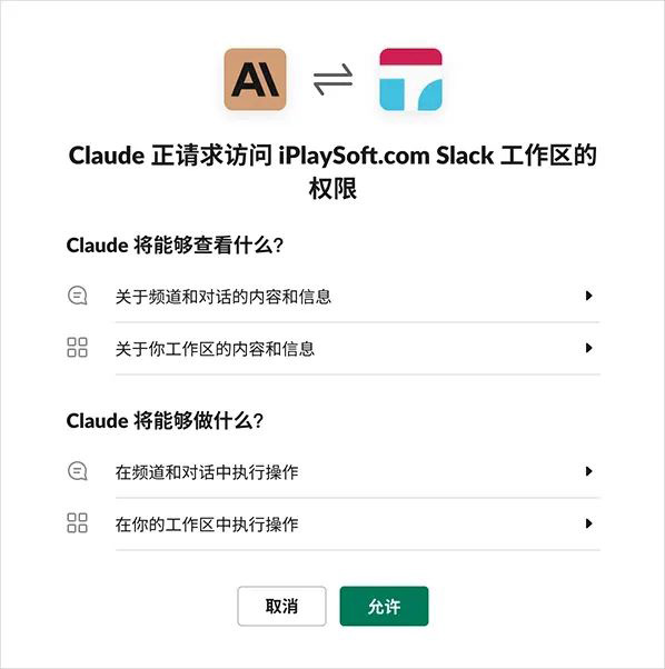 Slack 賬號和工作區都準備好了就可以“一鍵安裝 Claude”了。但現在你需要先準備一個美國 IP 的網絡環境,然后「點擊 Add to Slack 這個鏈接」即可在 Slack 里添加 Claude 機器人應用。看到對話框,點擊“允許”給予權限即可,至此我們就已經全部搞定了,非常的簡單!