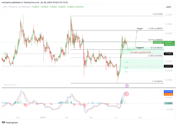 一旦這一價格區間的失衡得到解決,XRP的漲勢可能會進一步擴大,目標價位為0.6666美元,接近3月11日高點0.7440美元的斐波那契回撤位(7月5日低點0.3823美元)。